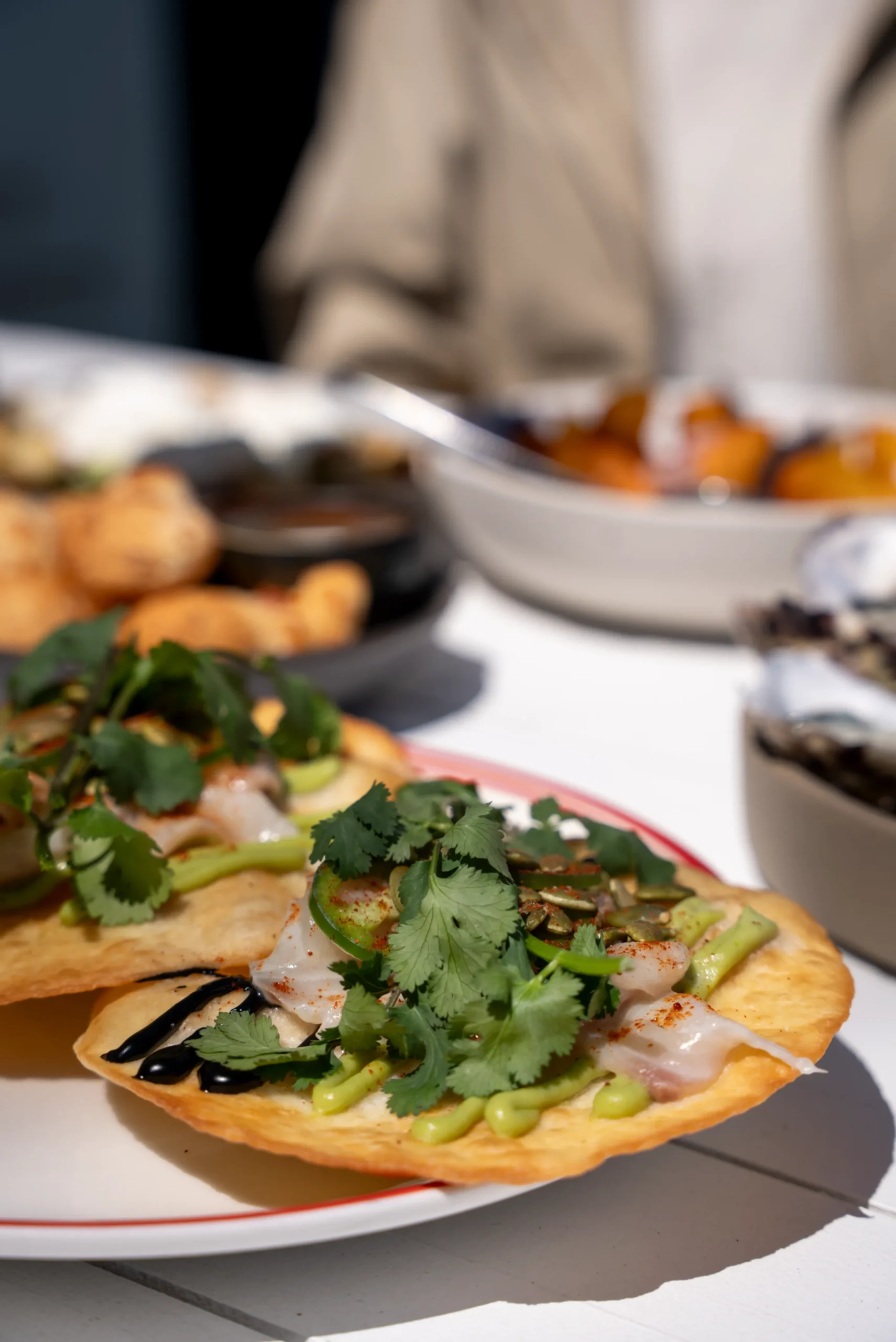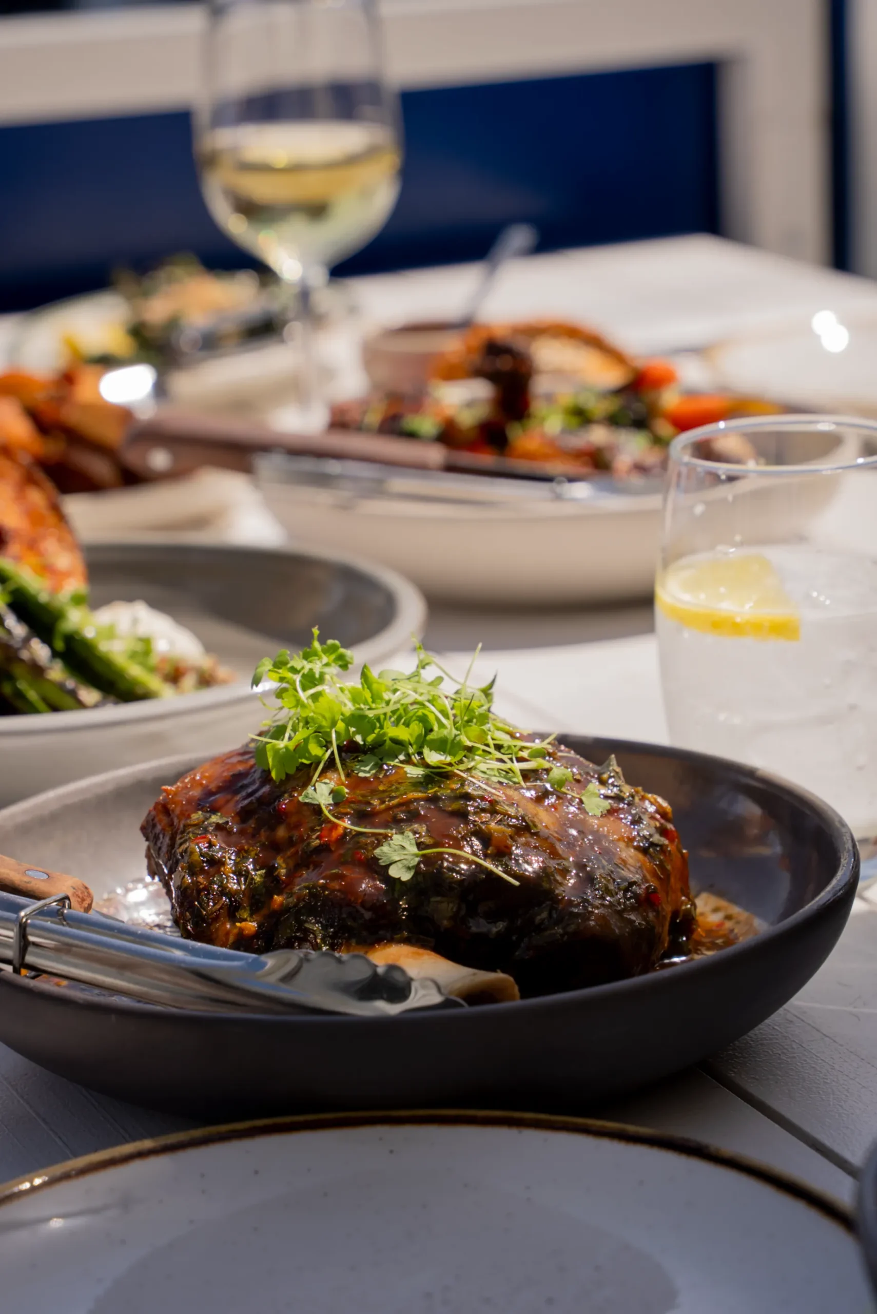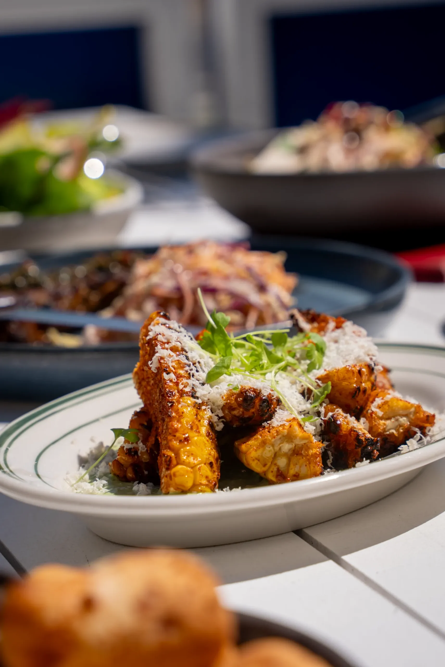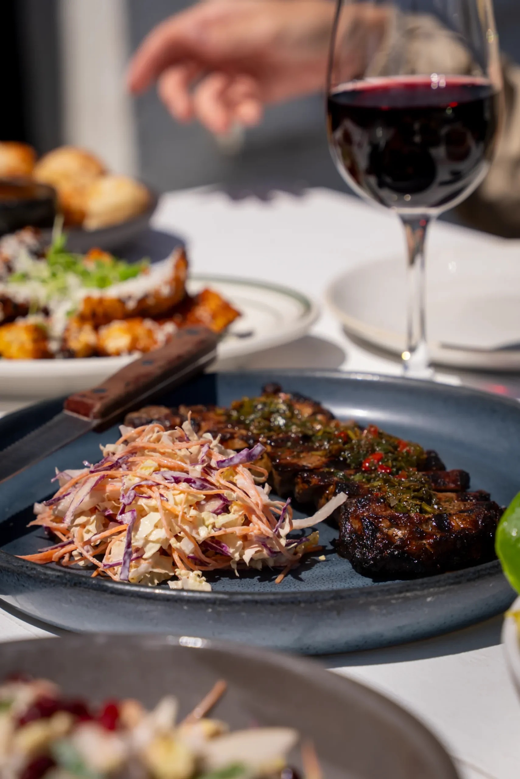 Ostras Naturales Aceitunas Chipas Fritas y Salsa Golf Ensalata de Burrata Y Tomate Croquetas Taco de Kingfish Ceviche de Atun Empanada de Cordero Empanada de Espinacas y Ricot Pan de Gambas Chorizo Criollo Costillas de Maiz Ahumado Verduras Asados y Quinoa Calamares Fritos Pollo a la Parilla Bistec de Solomillo Costillar de Res Costillar de Cordero Ensalada Mixta Ensalata de Col con Granada Papas Bravas Broccolini a la Parrilla Churros Tarta de Queso Vasca Quemada Helado de Alfajor